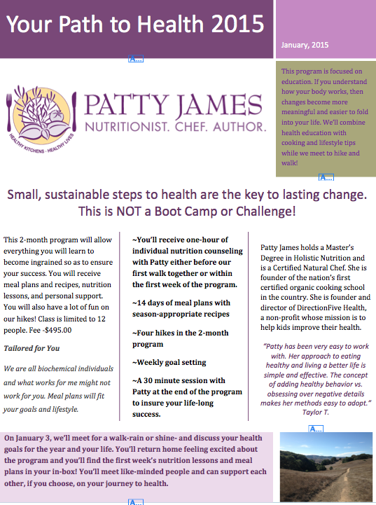 If you have plans to make 2015 your year to obtain your good health, then I’m here to help. The key to success is to make small, sustainable steps! Join me and have fun while you learn so much, are well-supported, and by Spring feel like a new you! We’ll take some lovely walks/hikes, I will demystify nutrition for you, you’ll receive recipes and meal plans and you’ll receive a one on one consultation at the beginning and end of the program!