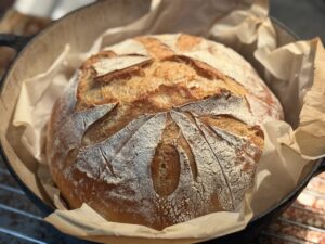 Cover the pot. Lower the oven to 450F and bake for 30 minutes, covered. Remove the lid, lower the temperature to 400ºF, and continue to bake for 15 -20 minutes more. Ideally, cool on a wire rack for 1 hour before slicing. (Good luck with that…)