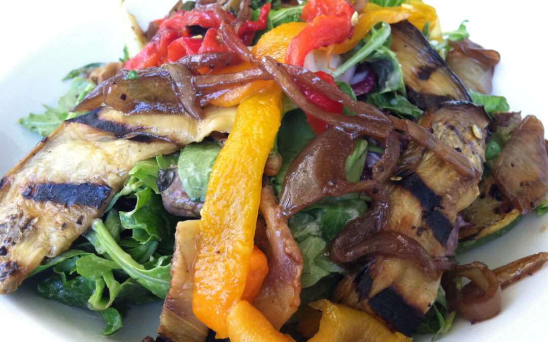 I like arugula and sunflower sprouts tossed with lemon and olive oil. Often times I add diced red and yellow peppers to the greens. Next I slice eggplant, peppers, summer squash and red onions and brush with olive oil and a little sea salt and pepper. Grill just until soft-you don’t want them mushy! Cool for just a moment and place atop the dressed greens. That’s it! The choices are endless!
