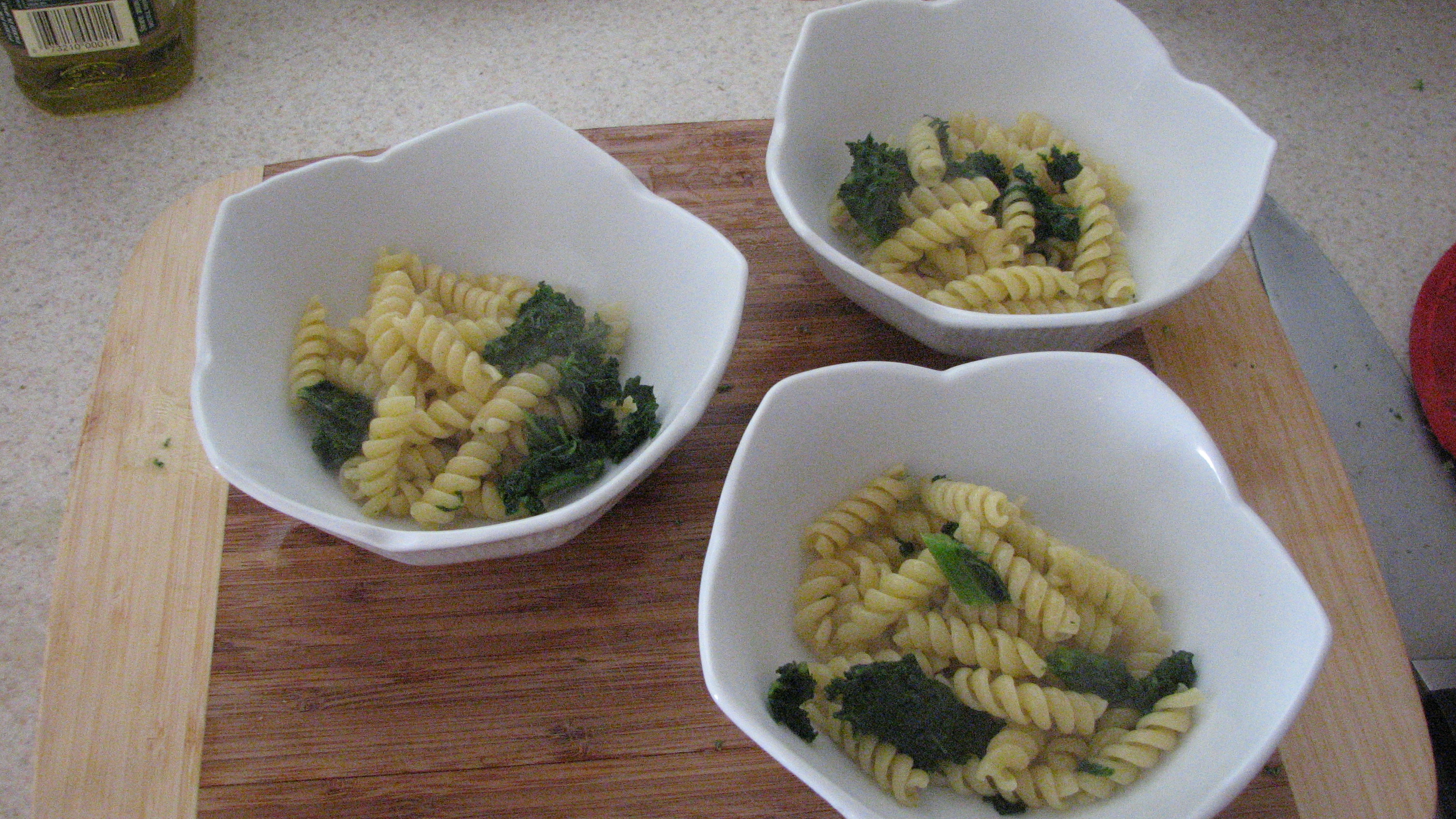 Put a pot of water on to boil for the pasta. Chop 3 big leaves of kale to add to the pot with the pasta. You’ll use about 1/2 pound of pasta.