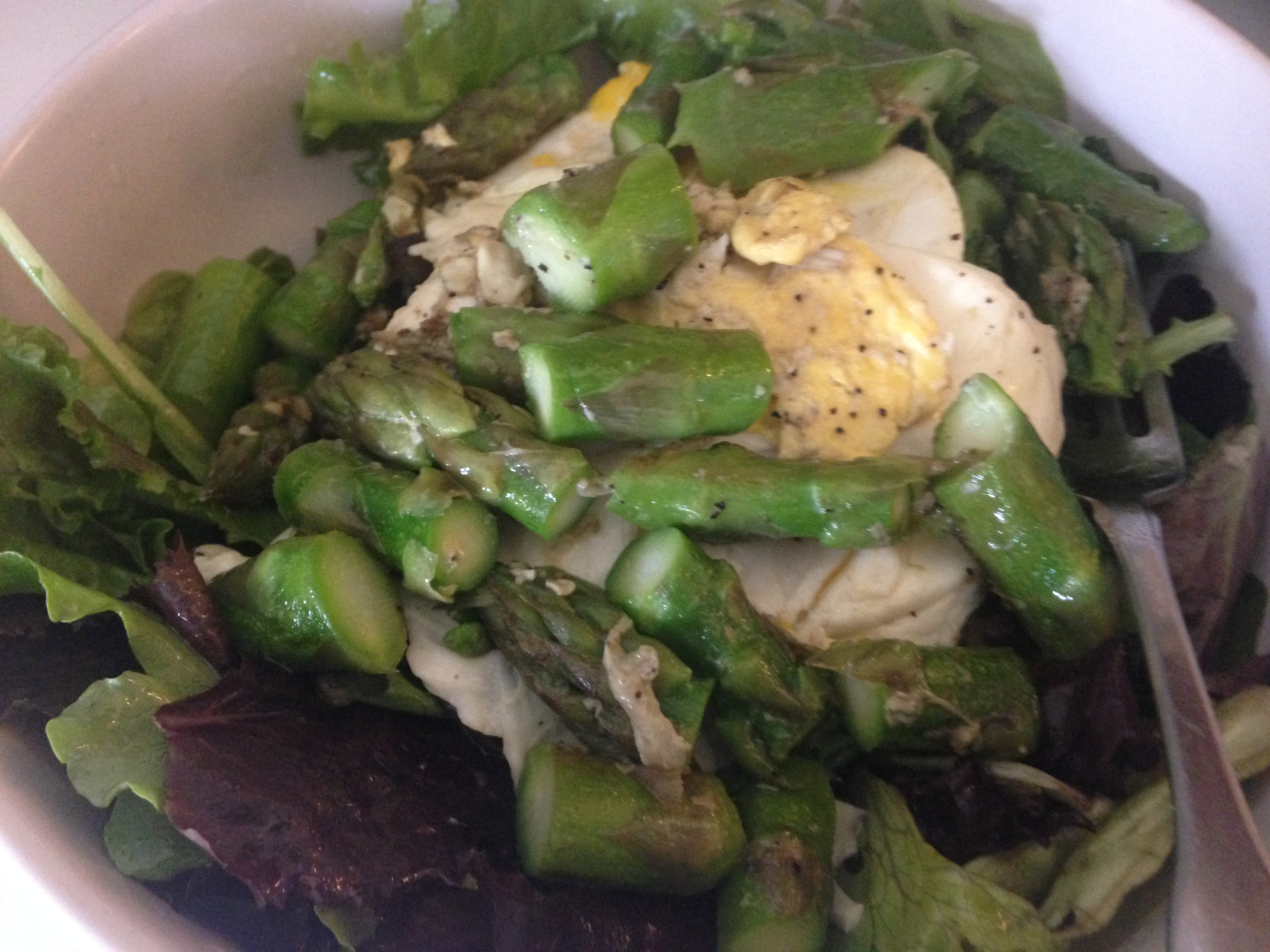Simply use any kind of lettuce you like, and if it feels more like breakfast to you, cook an egg-poached/fried/soft-boiled- and place on top of the lettuce. Drizzle with a little olive oil and lemon juice and that could be it. I topped my salad with steamed asparagus.
