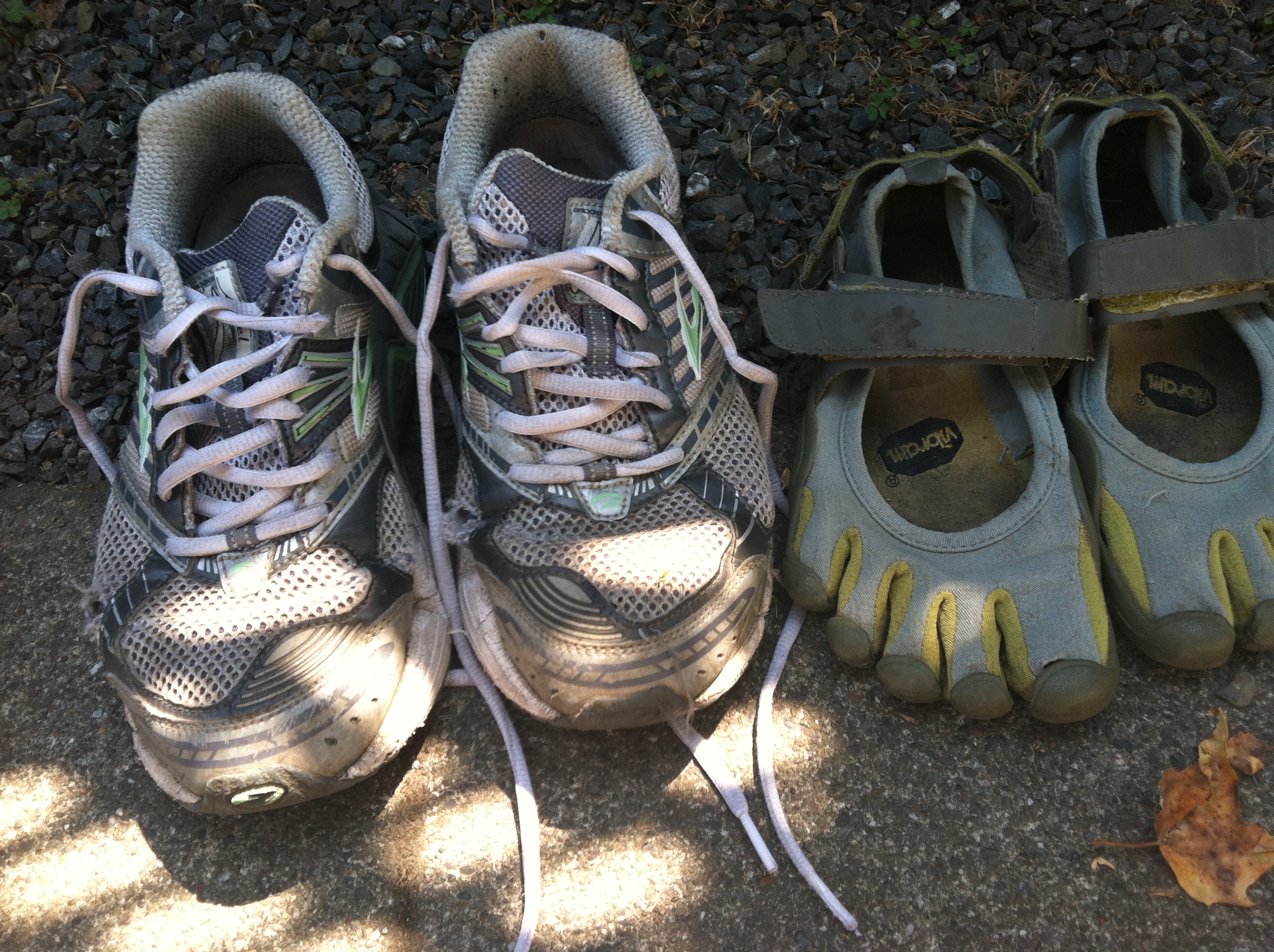 Old tennis shoes, old Vibram 5-Fingers, my I-Phone to listen to music (although I don’t often), the app Strava to keep track of my progress and Evernote for journaling.