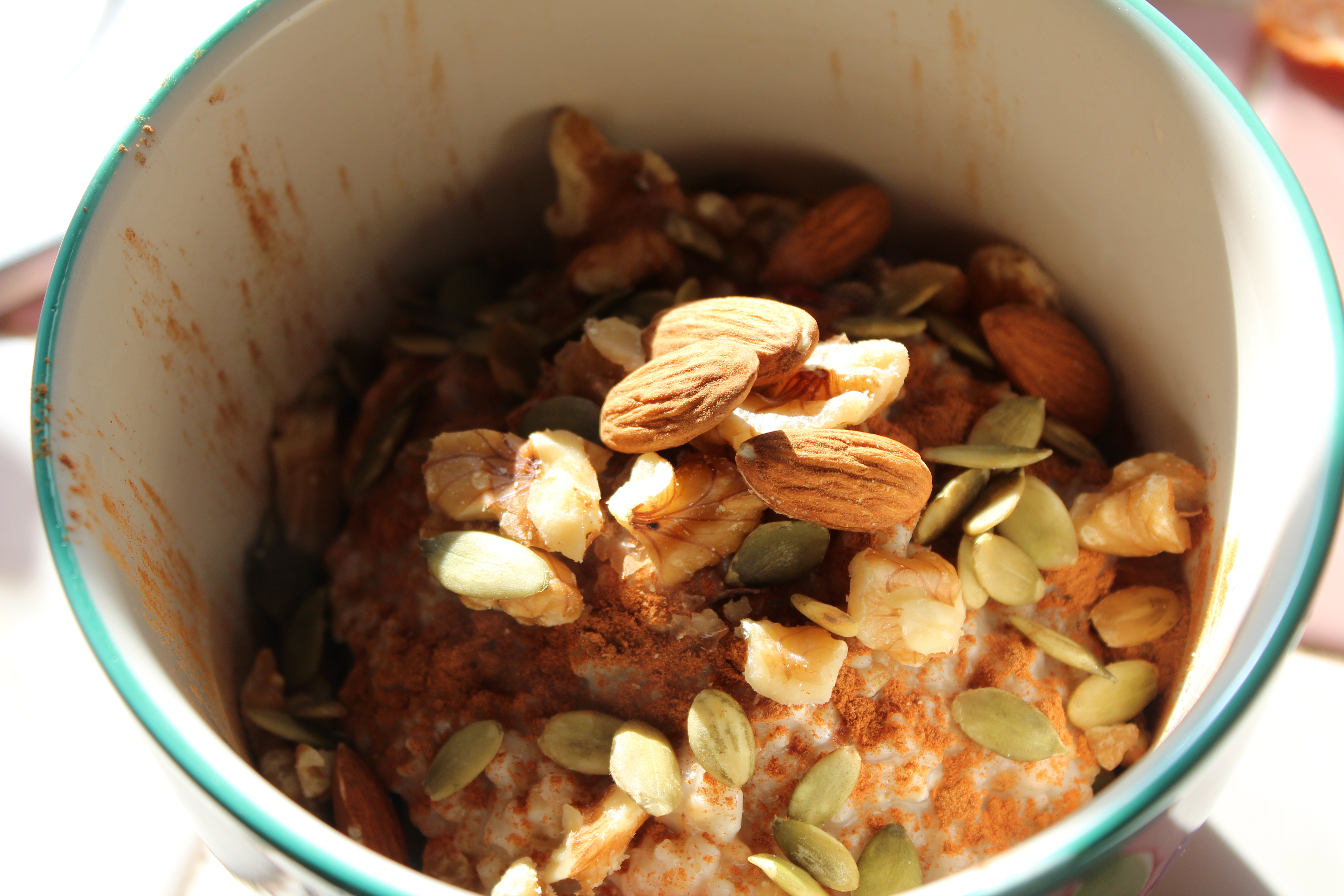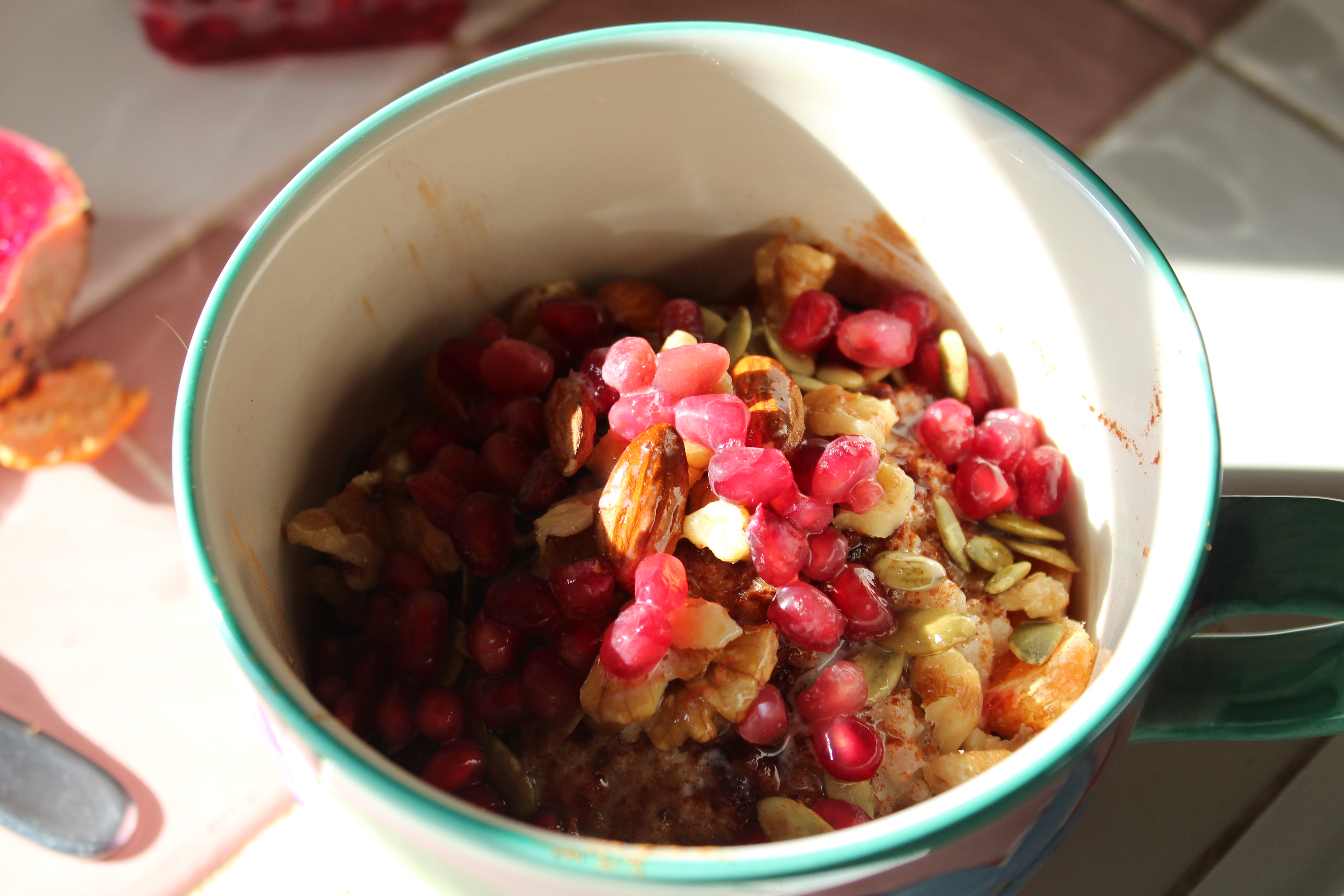 This is a breakfast Buddha Bowl, and yes, it might just look like a bowl of cereal with fruit and nuts. Instead of raw greens, which most Buddha Bowls have has a base, this one has fruit as a base. Next is cooked steel cut oats, then (a lot of) cinnamon, and pomegranate seeds and nuts. Buddha Bowls are generally drizzled with some type of sauce, so I melted a little ghee with a little coconut oil, and drizzled it with that. Very good! If you like you can use a little milk of your choosing or freshly juiced orange juice like you would on a bowl of oatmeal.