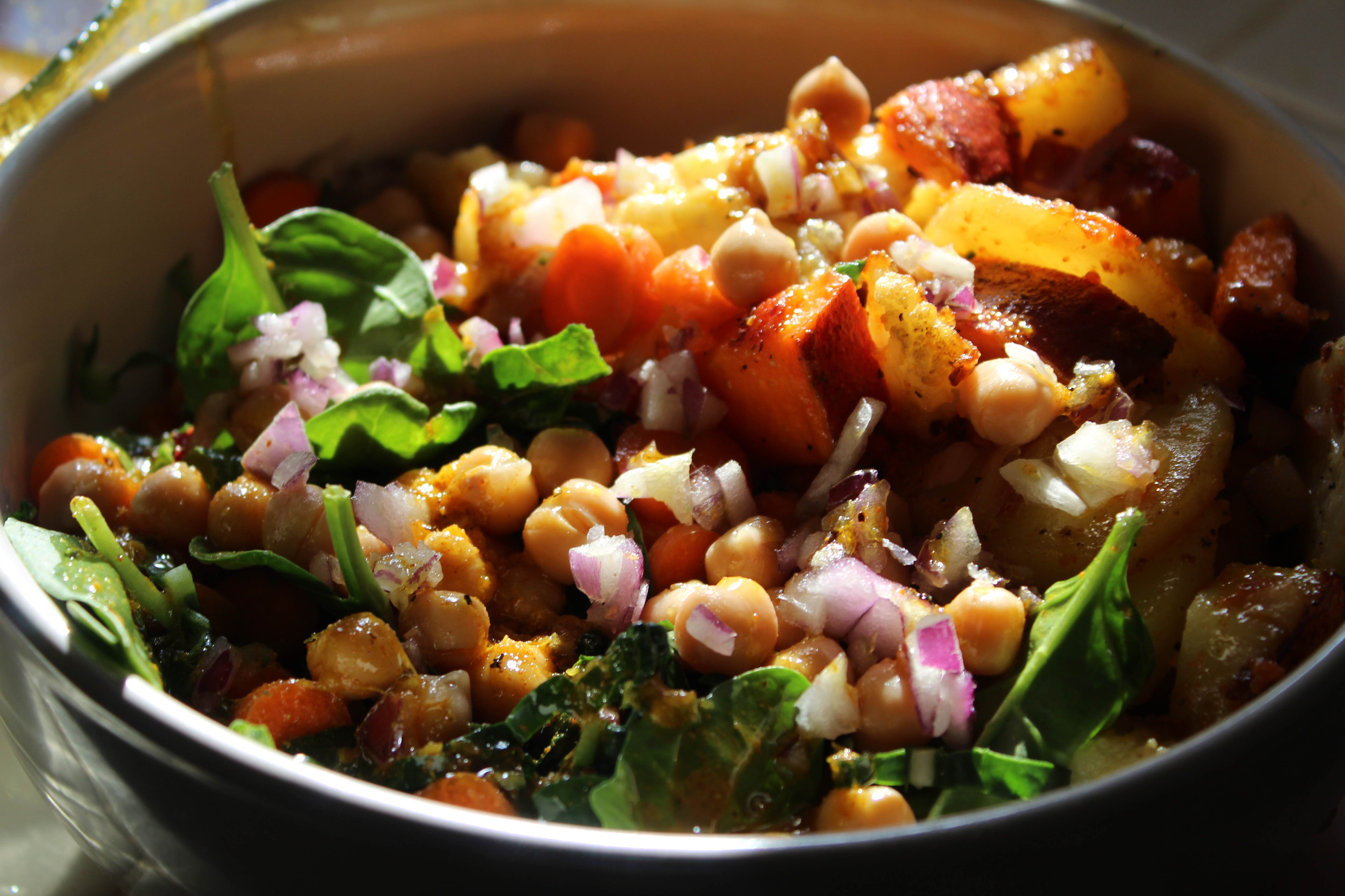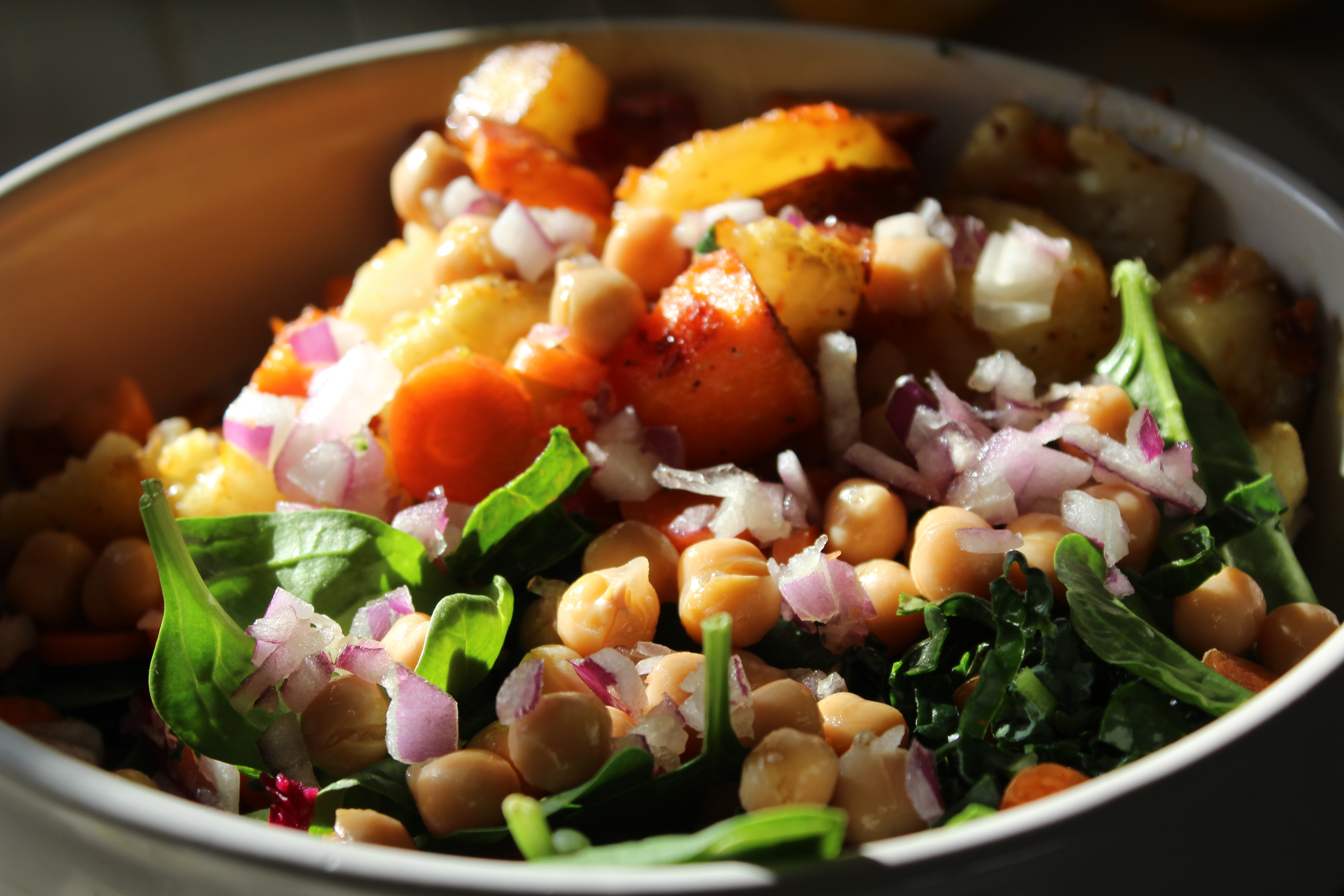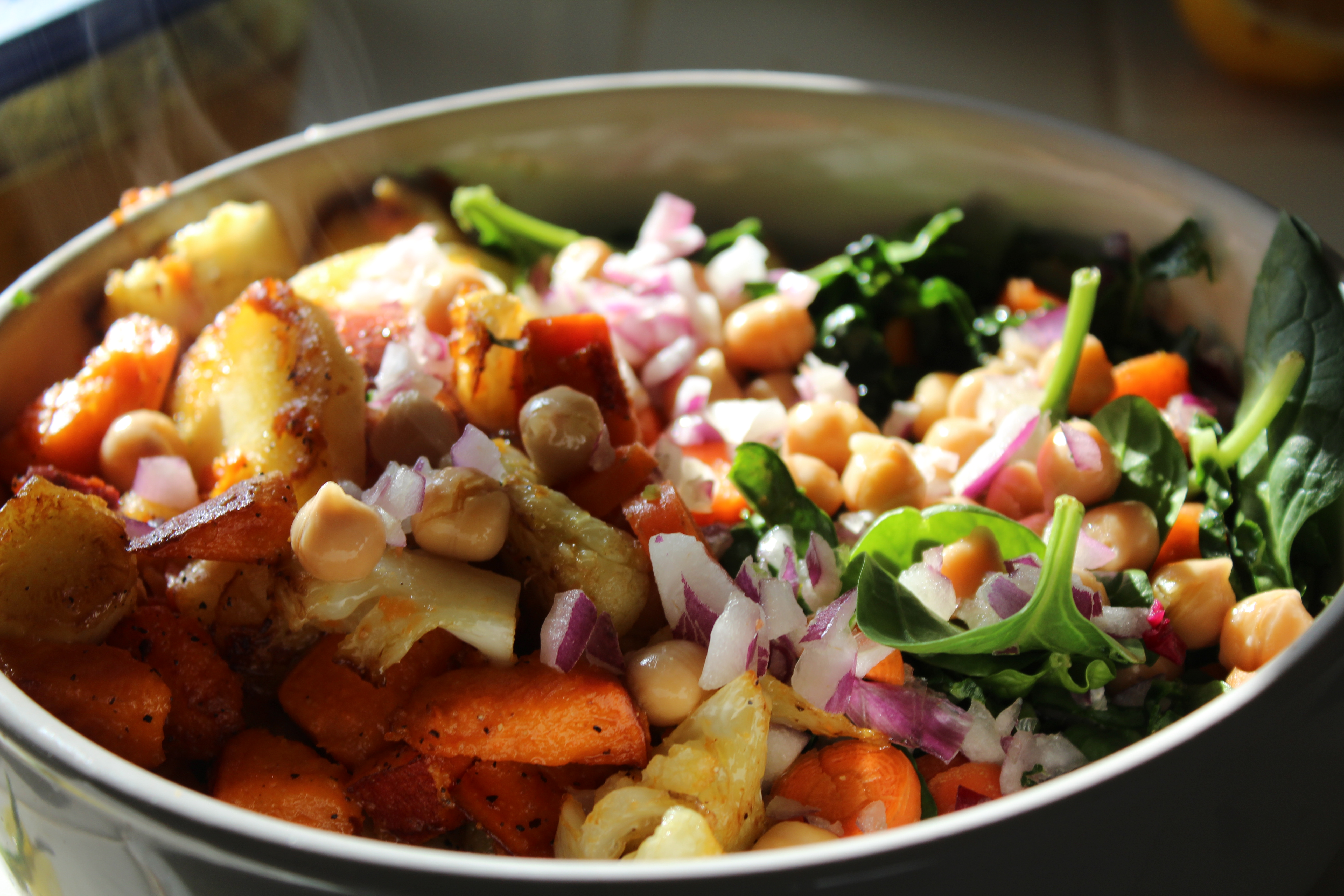 The bowl started with raw ingredients: spinach and slivered kale, then diced carrots and red onions. Next came the cooked ingredients: parsnips, yams and cauliflower. Garbanzo beans were placed on top, then more red onions and the bowl was drizzled with a lime/curry vinaigrette.