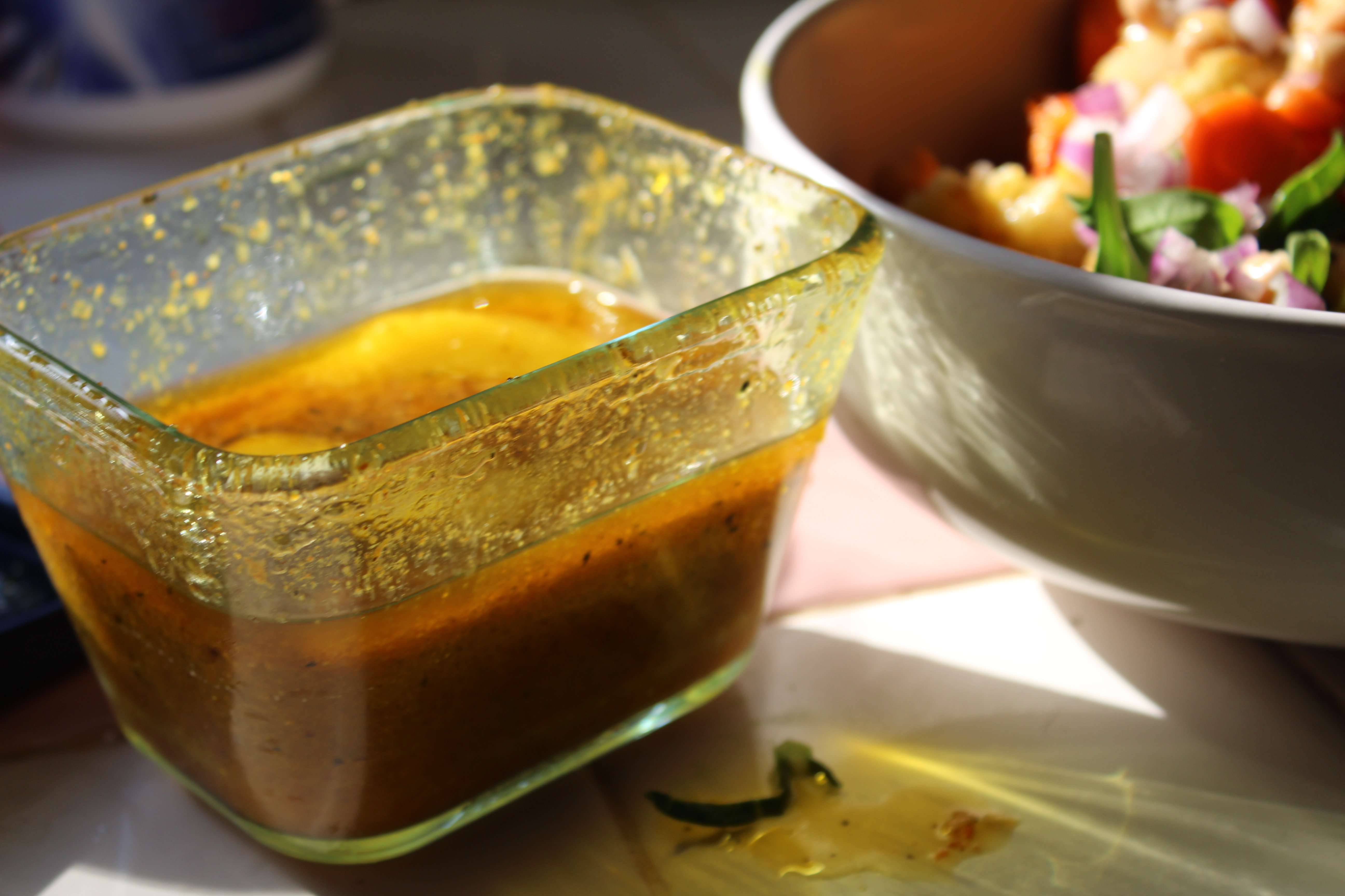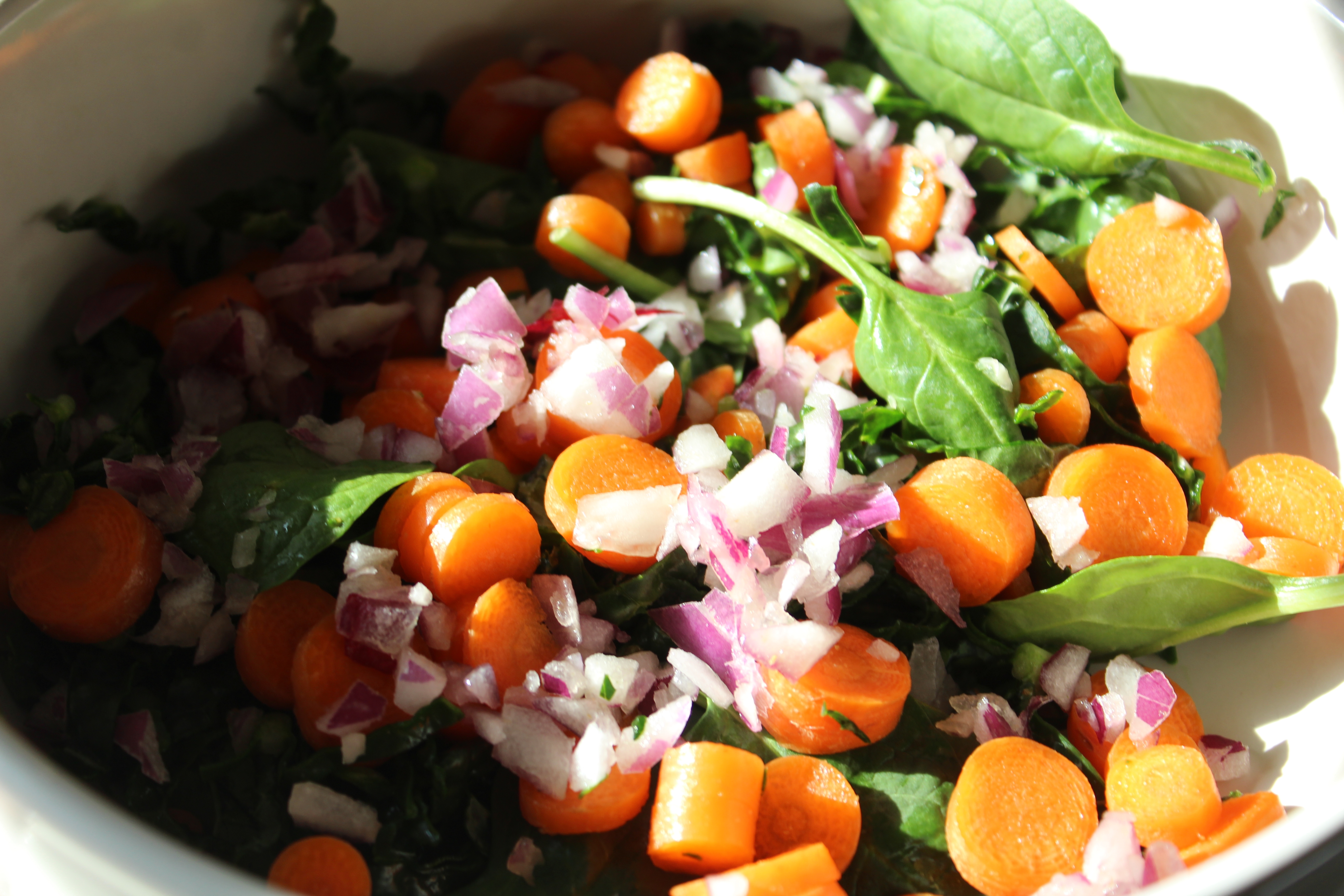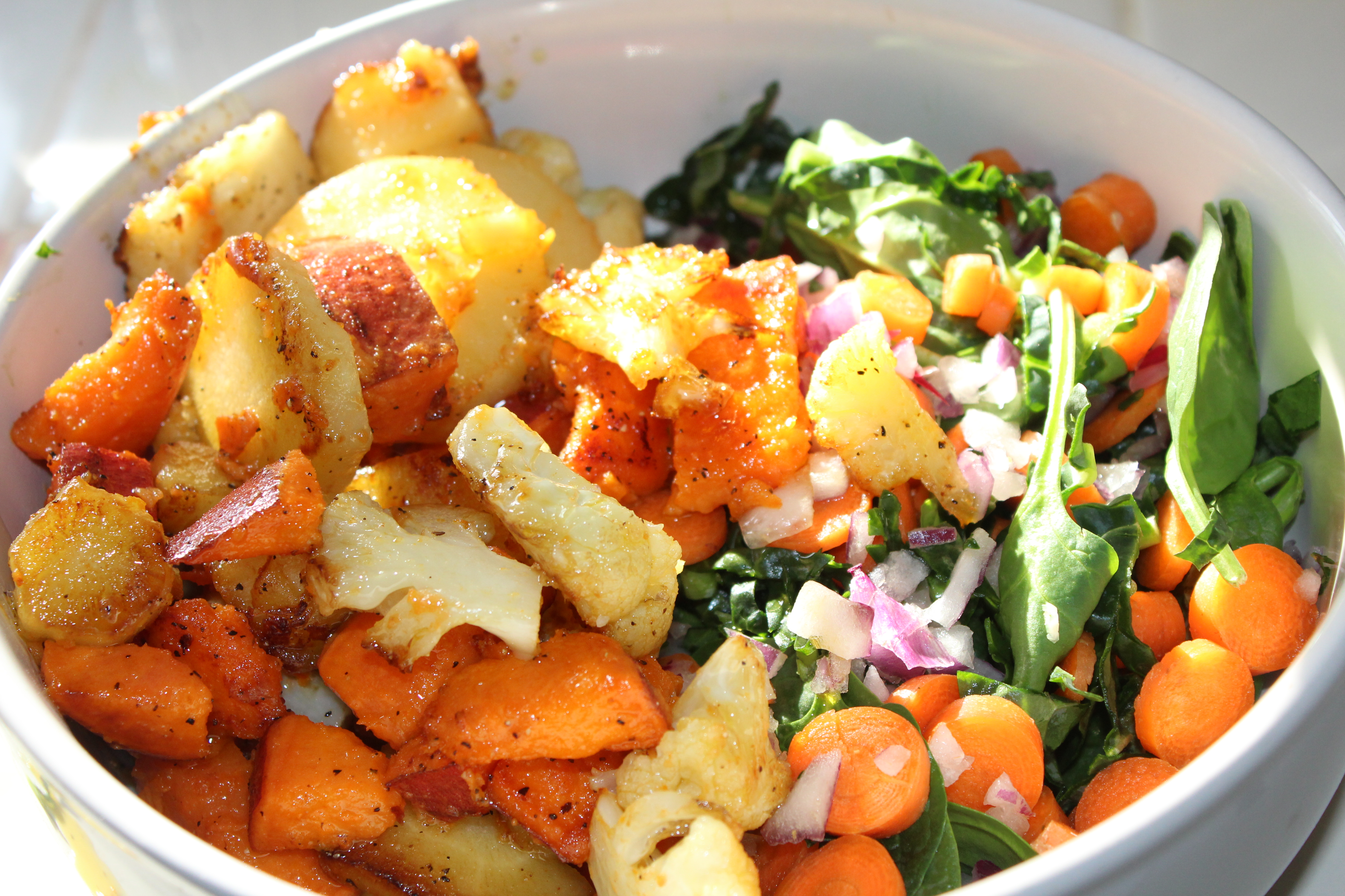 The bowl started with raw ingredients: spinach and slivered kale, then diced carrots and red onions. Next came the cooked ingredients: parsnips, yams and cauliflower. Garbanzo beans were placed on top, then more red onions and the bowl was drizzled with a lime/curry vinaigrette.