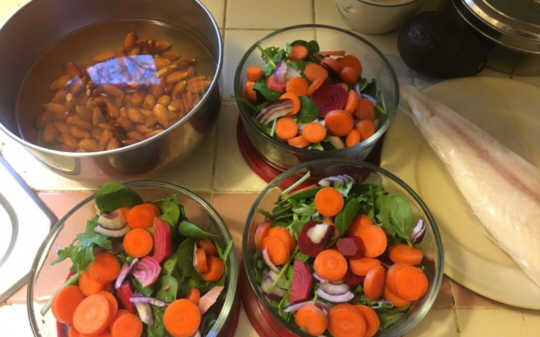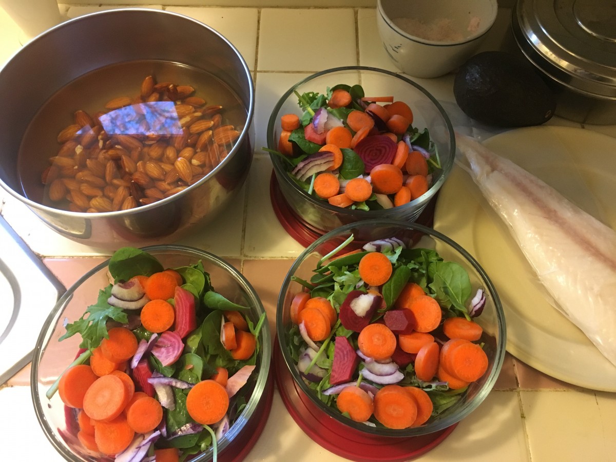 In a total of 30 minutes I made three salads, almond milk, and tomorrow’s breakfast. After the hardboiled eggs are cooled, I’ll peel them and place one in each salad. I’ll cook the fish tonight. An important note here is that there was no food waste!
