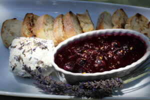 Toast sliced bread and spread goat cheese on top. Top with blueberry jam and extra lavender or grated lemon for garnish.