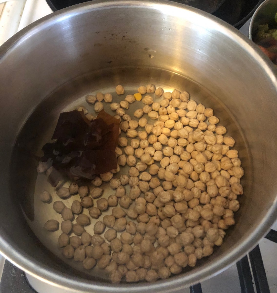 After my fridge was all pretty with freshly prepped veggies, I added water to the trimmings to make a little veggie stock, and I also soaked some garbanzo beans with a little seaweed (I use Kombu generally, but was out, so I substituted Wakame), which makes them more digestible and adds minerals. Homemade hummus is a healthful, inexpensive dish to make and perfect for all those chopped veggies.