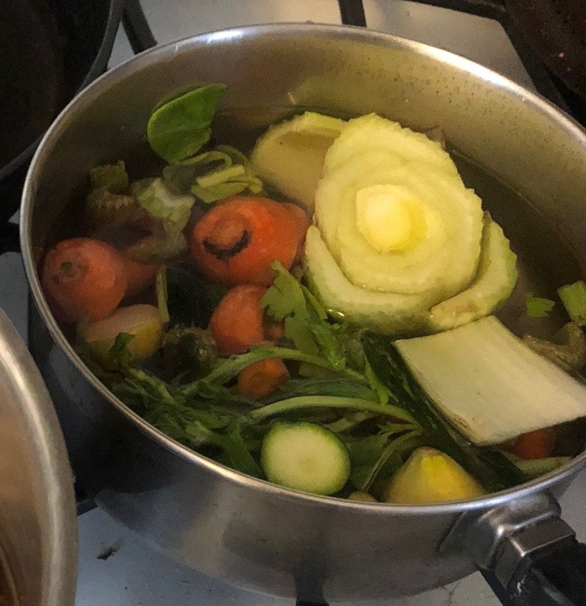 Have your salad spinner out to dry your herbs and leafy greens, if you have one. If not use tea towels to dry. Also, have a saucepan ready for some of the veggie trimmings to make homemade stock. Waste not, want not!