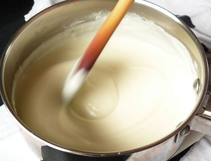 Slowly whisk in a small amount of milk to form a smooth paste. Continue until all the milk has been whisked in and the sauce is thick. Add sea salt & nutmeg to taste.